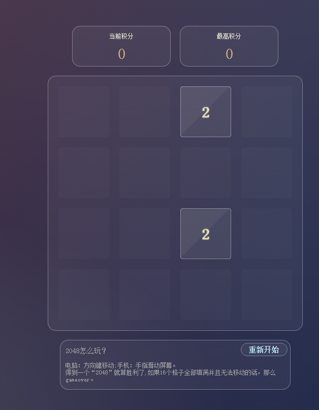 html5数字2048小游戏源码下载。游戏介绍:2048游戏怎么玩?电脑:方向键移动;手机:手指滑动屏幕。得到一个“2048”就算胜利了,如果16个格子全部填满并且无法移动的话,那么gameover。有需要的朋友可以直接下载使用,本段代码可以在各个网页使用,本段代码兼容目前最新的各类主流浏览器,是一款非常优秀的特效源码!