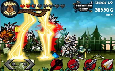 每个关卡通过后,玩家都会获得一定数目的金币,用这些金币可以在游戏的商店中购买或者升级武器和防御装备。游戏为玩家准备了很多种武器和装备,有大刀、铁鞭、手枪、炸弹、防护衣、遁甲等等,不过这些装备都比较贵,所以玩家在每次购买和升级的时候都要好好琢磨一下哦~