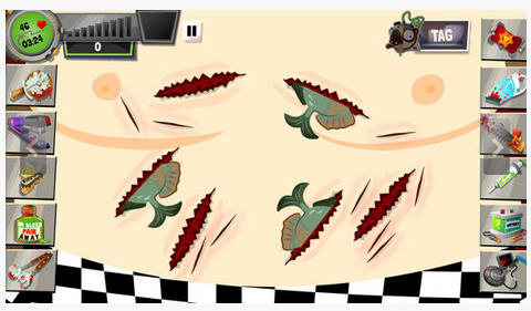 开发商adult swim新发布的《疯狂外科医生3》Amateur Surgeon 3是该作的第三部作品,从本质上来讲该作就是一款卡通画风的恶搞模拟经营游戏,玩家将在各种伤情的奇葩病患身上实行业余的外科手术,使之更为凄惨的痊愈。《疯狂外科医生》将恶搞风格发挥到极致,闻所未闻的病症在游戏里相继出现,什么心脏扎了牙刷,食人鱼钻进肚子里,玩法简单恶搞,根据病状来点击屏幕周边的暴力器材来完成相应的手术操作即可,当然这些规律在新手指导中会给你讲解,箭头加行为效果的方式,让全英文的界面也不那么难以理解。